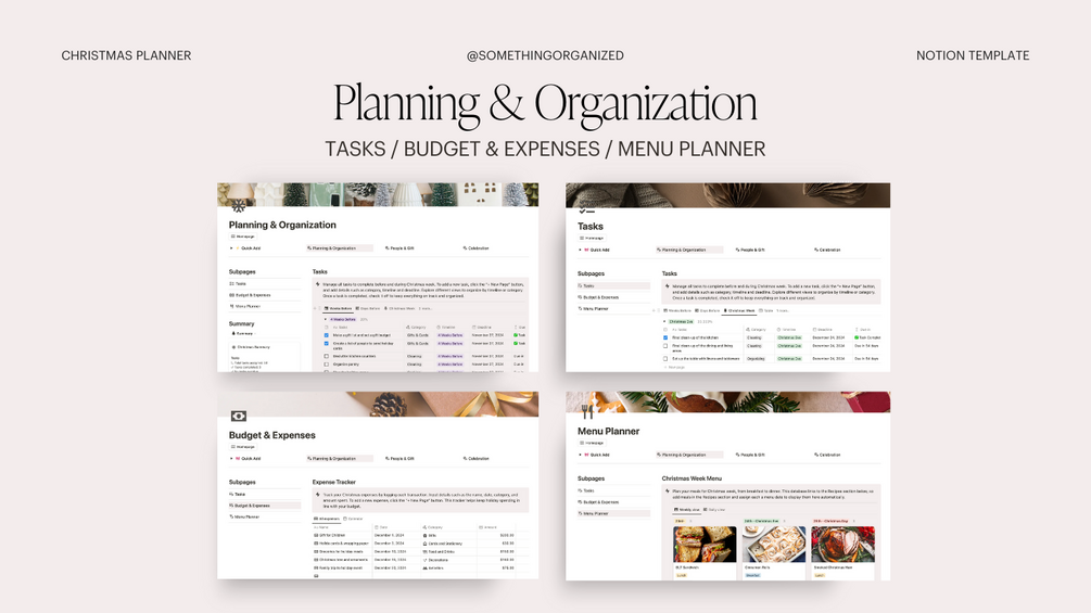 Transform your holiday season with this Ultimate Christmas Planner Notion Template! Created to keep every detail organized and festive, this planner is designed to help you stay on top of tasks, manage your budget, track gifts, plan meals, and keep track of guests and RSVP status—all in one place. You’ll also find dedicated sections for decorations, a grocery list linked to recipes, a mood board for inspiration, and tools for organizing events and trips.