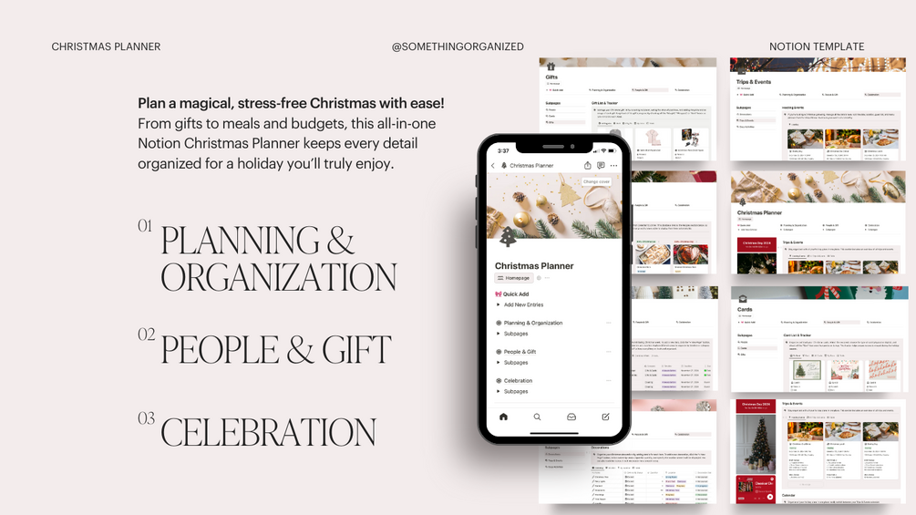 Transform your holiday season with this Ultimate Christmas Planner Notion Template! Created to keep every detail organized and festive, this planner is designed to help you stay on top of tasks, manage your budget, track gifts, plan meals, and keep track of guests and RSVP status—all in one place. You’ll also find dedicated sections for decorations, a grocery list linked to recipes, a mood board for inspiration, and tools for organizing events and trips.
