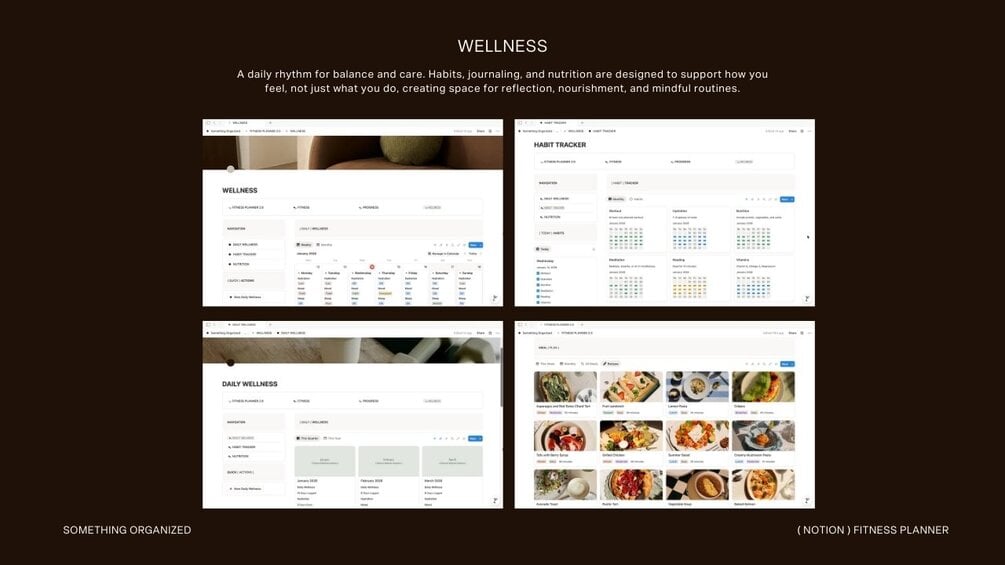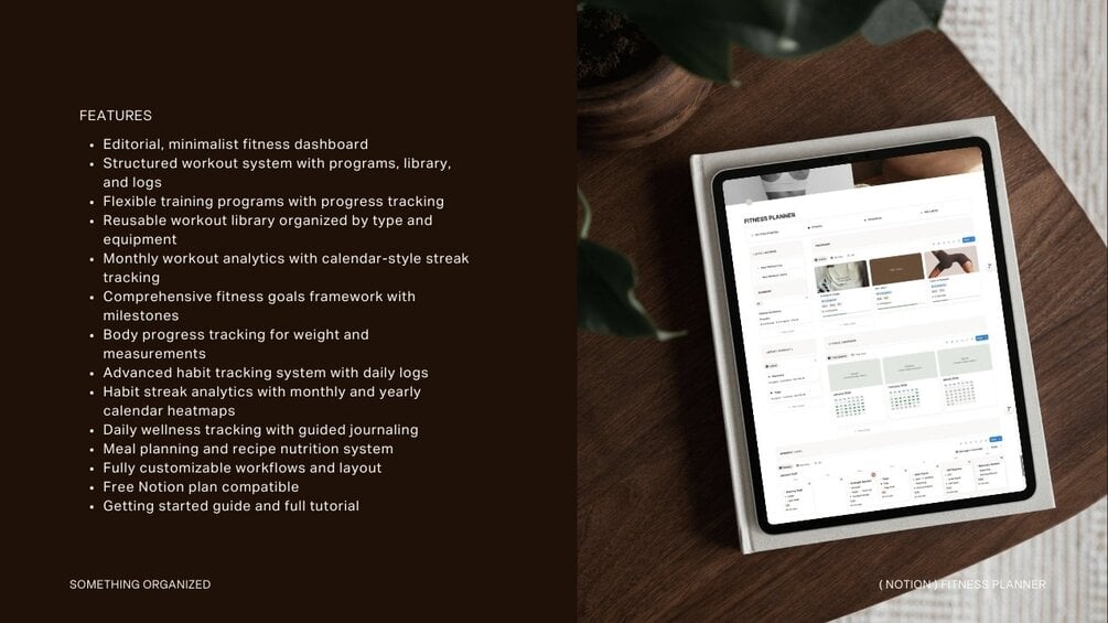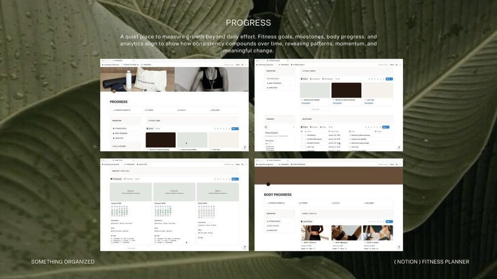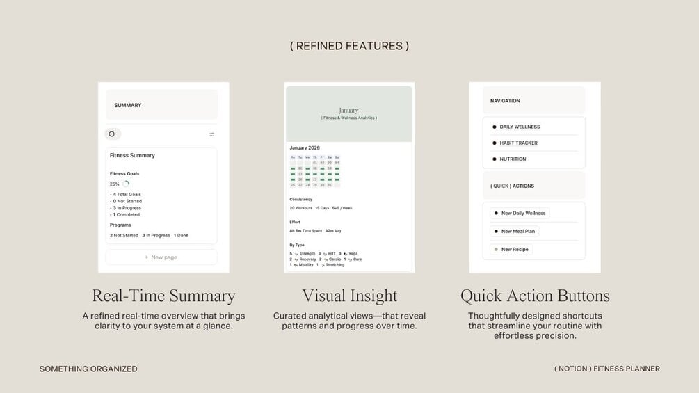 An editorial, minimalist fitness planner for intentional movement, mindful habits, and long-term progress — all in one refined Notion system.