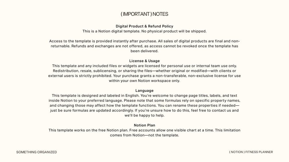 This template is designed and labeled in English. You’re welcome to change page titles, labels, and text inside Notion to your preferred language; however, please note that some formulas rely on specific property names, and changing those may affect how the template functions.