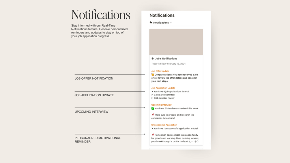 - Real-Time Notifications: Stay informed and motivated with timely reminders to keep your job search on track.